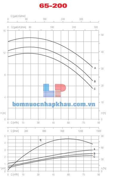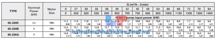 Biểu đồ lưu lượng đầu bơm Inox rời trục 2 Pole Pentax CAX65-200C
