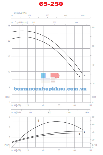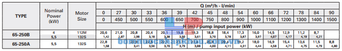 Biểu đồ lưu lượng đầu bơm Inox rời trục 2 Pole Pentax CAX65-250A