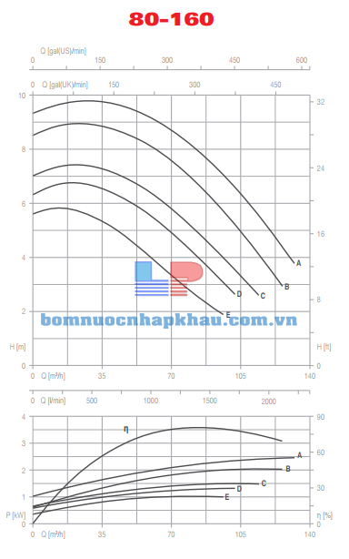 Biểu đồ lưu lượng đầu bơm Inox rời trục 2 Pole Pentax CAX80-160A