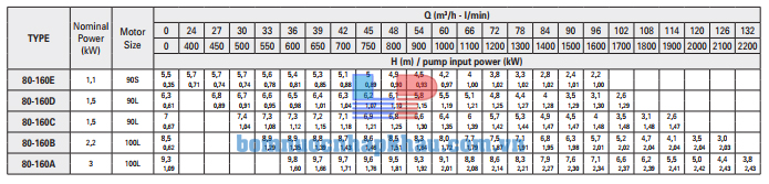 Biểu đồ lưu lượng đầu bơm Inox rời trục 2 Pole Pentax CAX80-160C