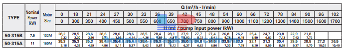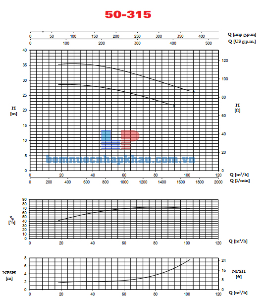 Biểu đồ lưu lượng đầu bơm rời trục đầu gang 4 Pole CA 50-315