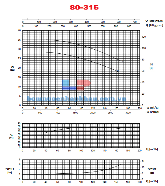 Biểu đồ lưu lượng đầu bơm rời trục đầu gang 4 Pole CA 80-315