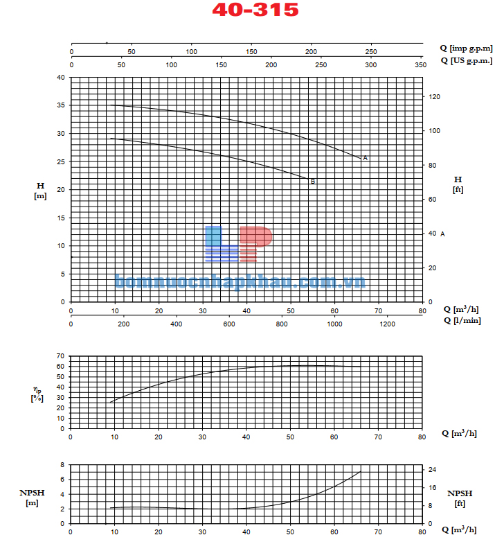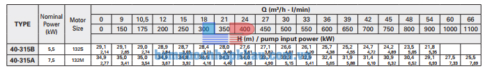 Biểu đồ lưu lượng đầu bơm trục rời đầu gang 4 Pole Pentax CA 40-315