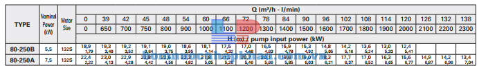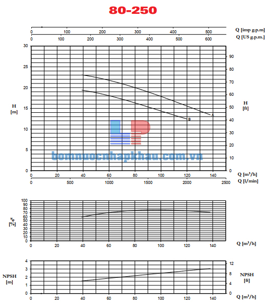 Biểu đồ lưu lượng đầu bơm trục rời Pentax CA 80-250B