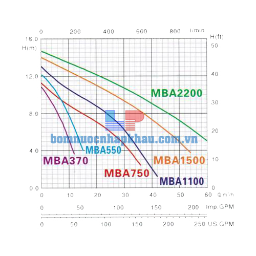 Biều đồ lưu lượng máy bơm chìm nước thải Mastra MBA-3700