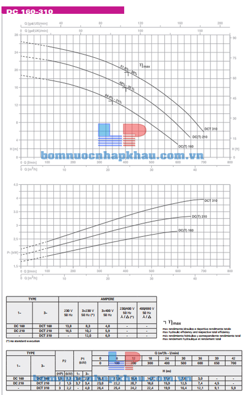 Biểu đồ lưu lượng máy bơm chìm nước thải Pentax DCT 310 (3Hp)
