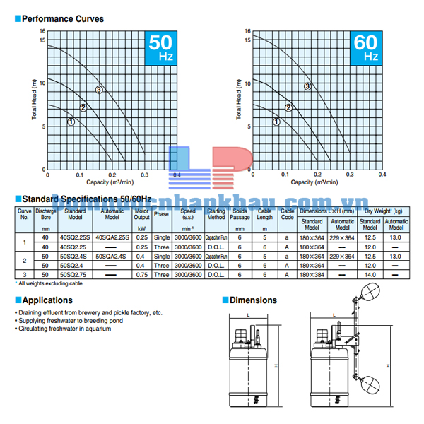 Biểu đồ máy bơm chìm nước thải Inox 304 cánh kín Tsurumi