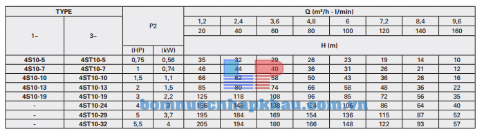 Biểu đồ lưu lượng máy bơm hỏa tiễn 4 inch Pentax 4S 10-13
