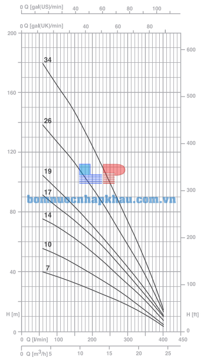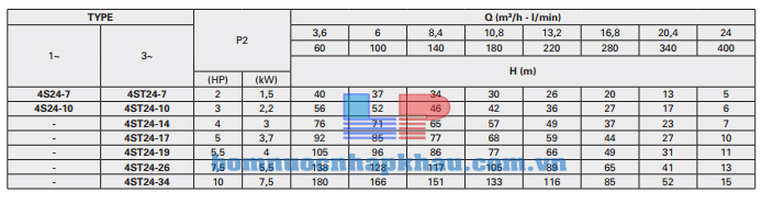 Biểu đồ lưu lượng máy bơm hỏa tiễn 4 inch Pentax 4S 24-10