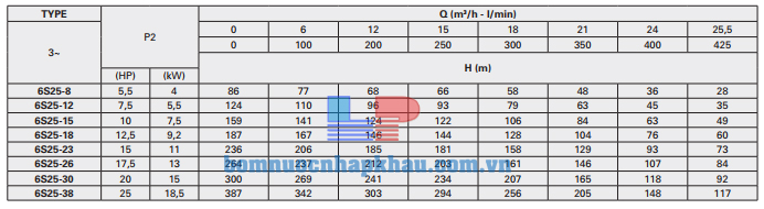 Biểu đồ lưu lượng máy bơm hỏa tiễn 6 inch Pentax 6ST 25-8 (GUỒNG 5.5HP)