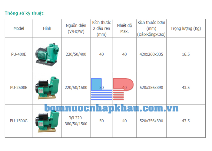 - Ưu điểm của dòng máy bơm nước tự mồi WiLo PU-400E là cột áp thấp nhưng lưu lượng lớn, mục đích sử dụng lưu lượng nước lớn