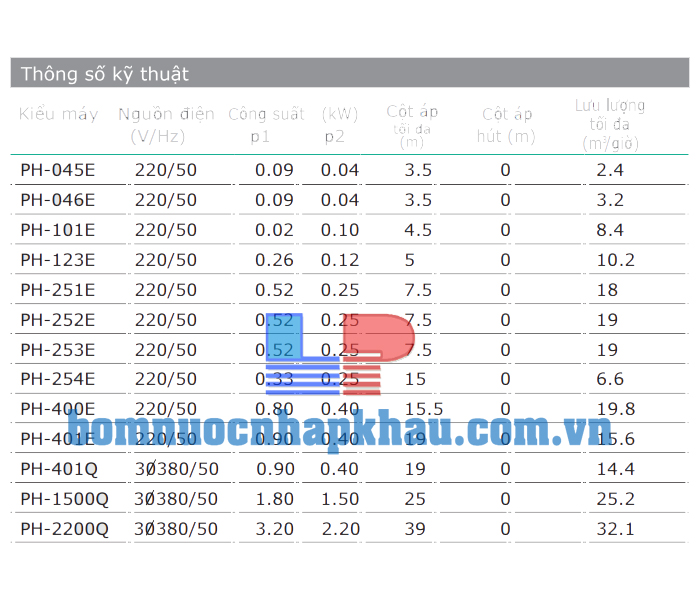 Cột áp tối đa: 52 – 18 m